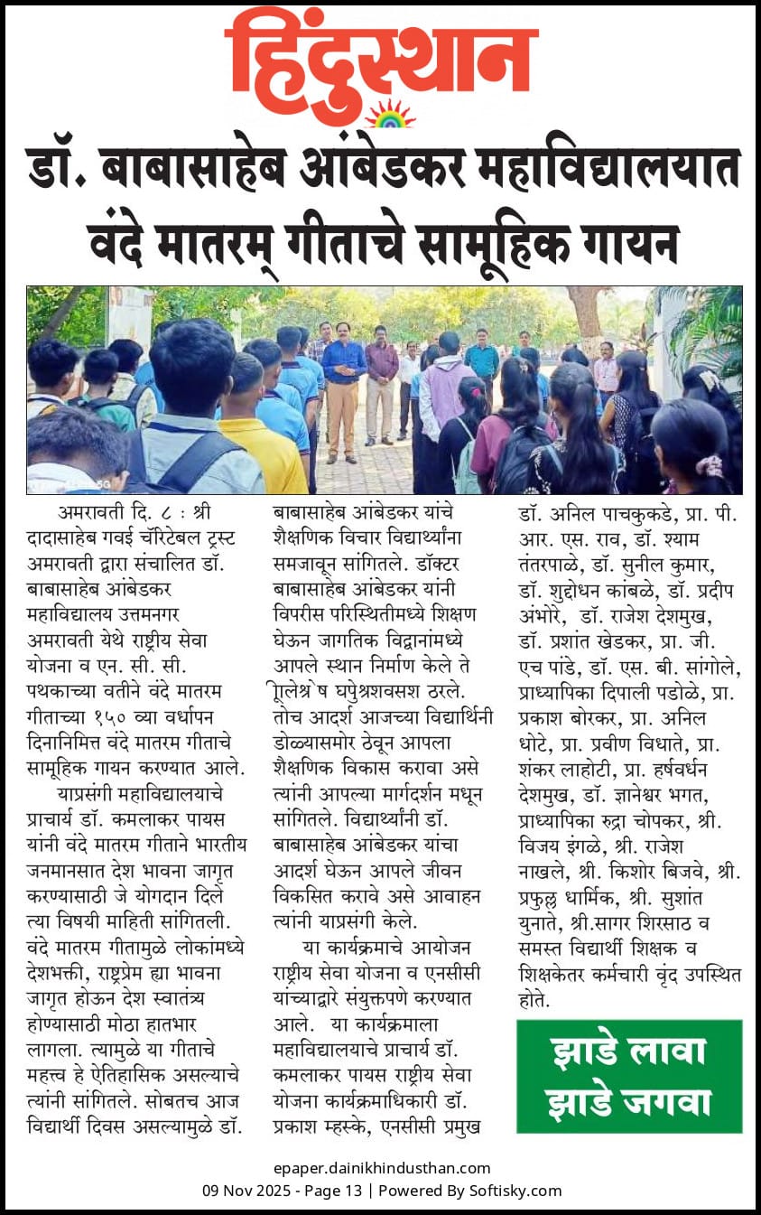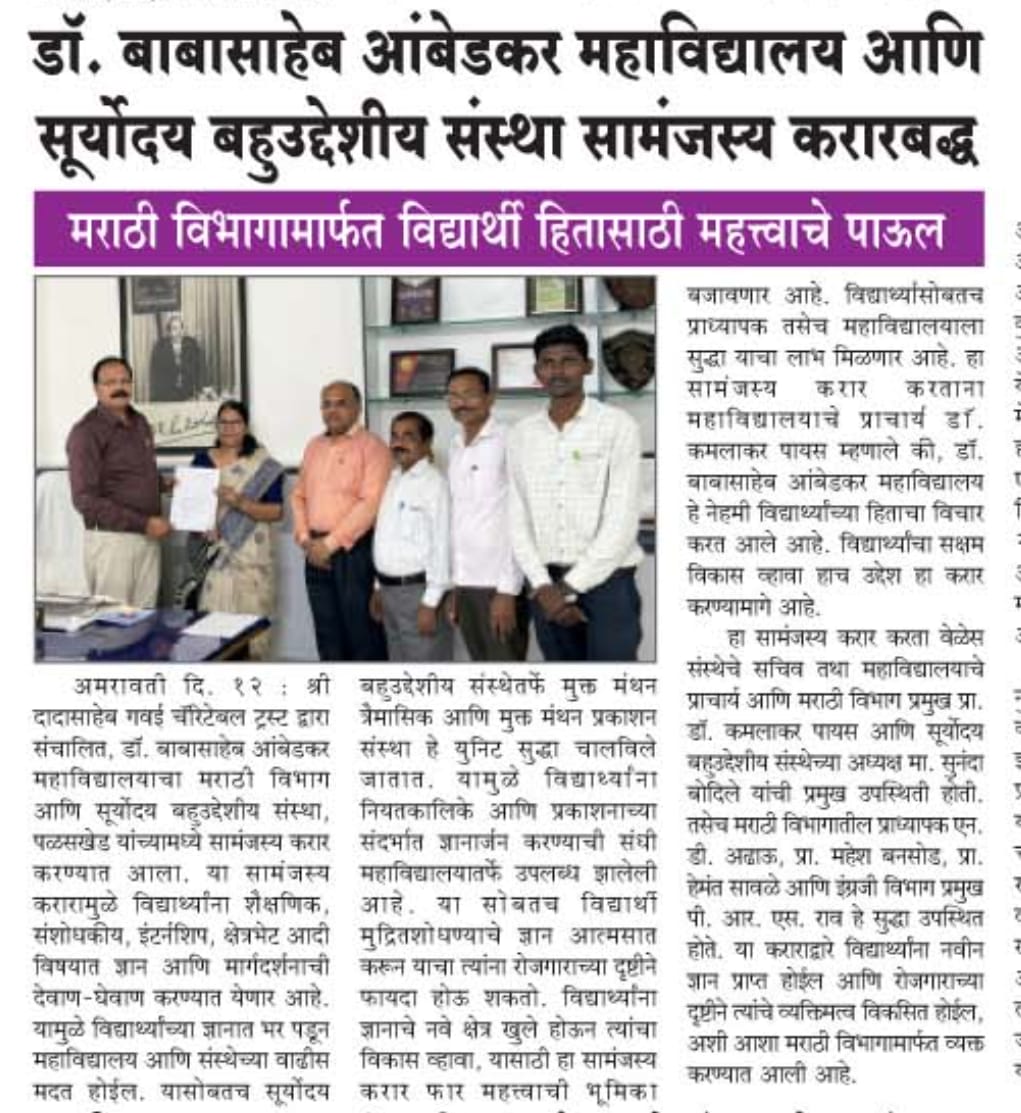 Dr. Babasaheb Ambedkar Mahavidyalaya , Amravati was established in 1972 by Hon’ble Late Shri. Dadasaheb Gawai, member of Rajya Sabha and Ex-Governer ( Kerala & Bihar States). It is a Grant-in-aid college, affiliated to SGBAU Amravati. It was recognized by UGC in 1994 under 2(f) and 12 (B) of the UGC Act 1956.