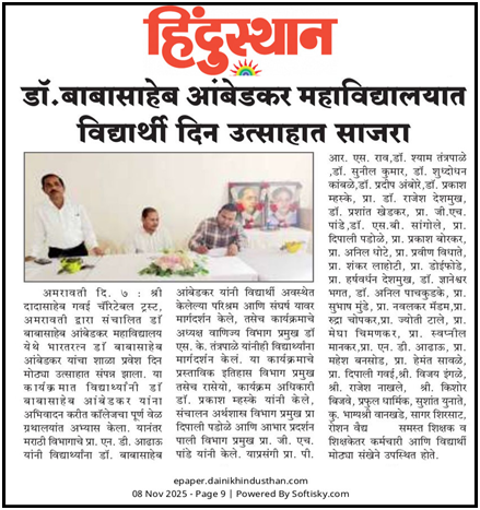 Dr. Babasaheb Ambedkar Mahavidyalaya , Amravati was established in 1972 by Hon’ble Late Shri. Dadasaheb Gawai, member of Rajya Sabha and Ex-Governer ( Kerala & Bihar States). It is a Grant-in-aid college, affiliated to SGBAU Amravati. It was recognized by UGC in 1994 under 2(f) and 12 (B) of the UGC Act 1956. It has been serving the educational needs of people living in Amravati